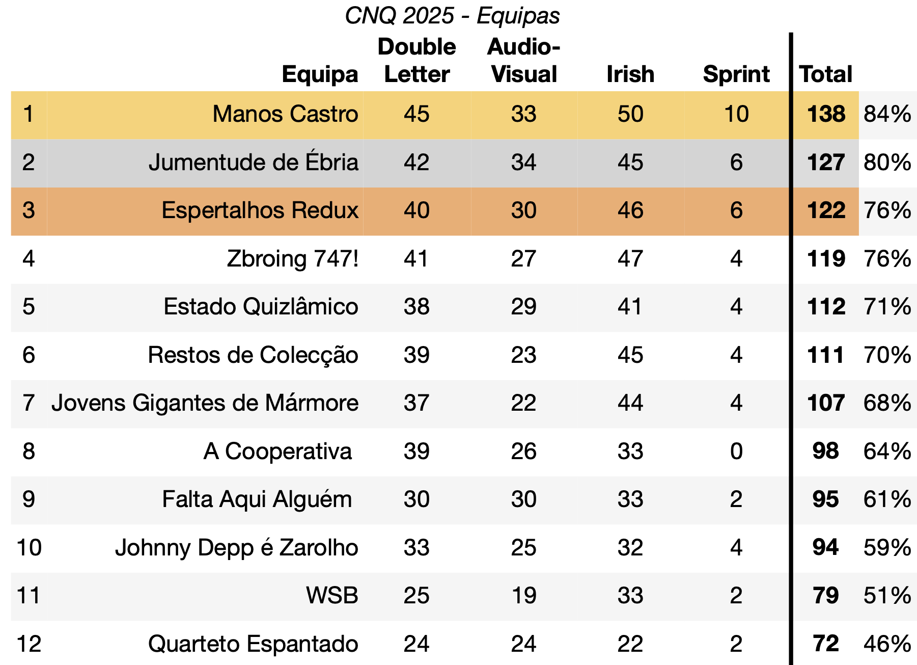 Após 4 horas, a liderança sorriu aos Manos Castro, graças a uma prestação consistente rematada por um pleno de 50 em 50 respostas no Irish Quiz. Eternos segundos lugares em todos os Campeonatos Nacionais anteriores (como Fernandos Mamedes), restava saber se esta mudança de nome finalmente lhes valeria o ouro — ou se continuariam a fraquejar no final.