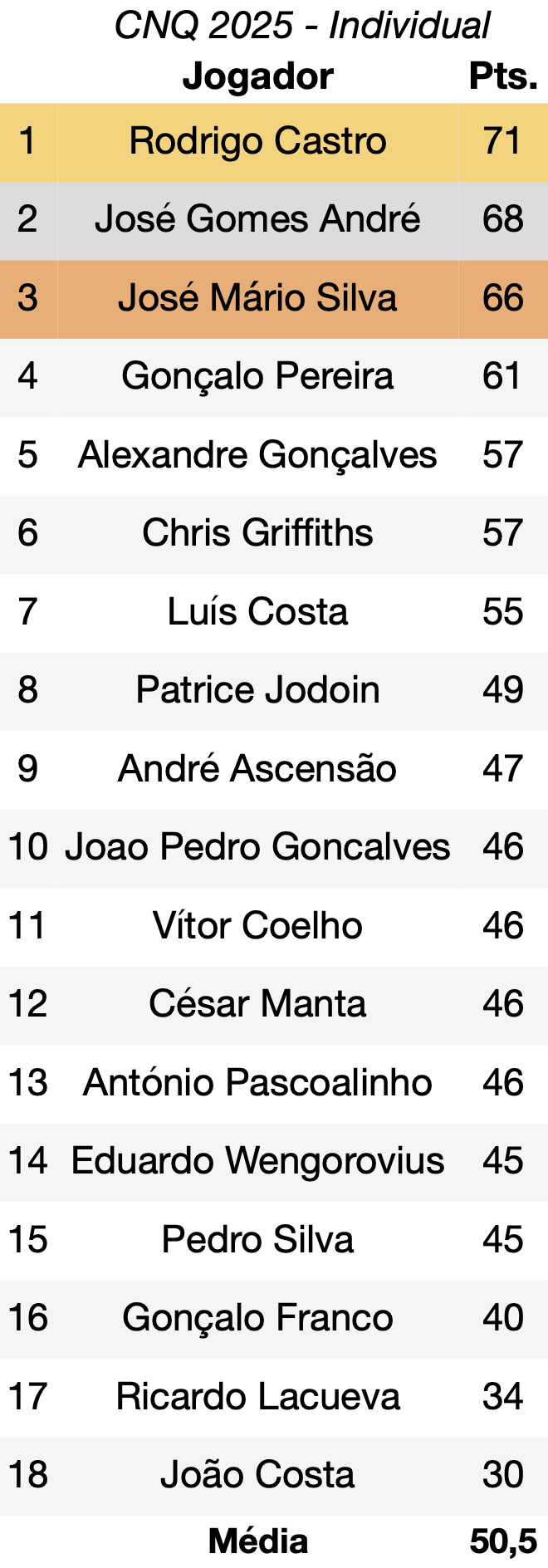 Na prova Individual o campeão foi o habitual Rodrigo Castro, vencedor em 2015 e 2016: teve mais 3 respostas certas que José Gomes André, e 5 que José Mário Silva.