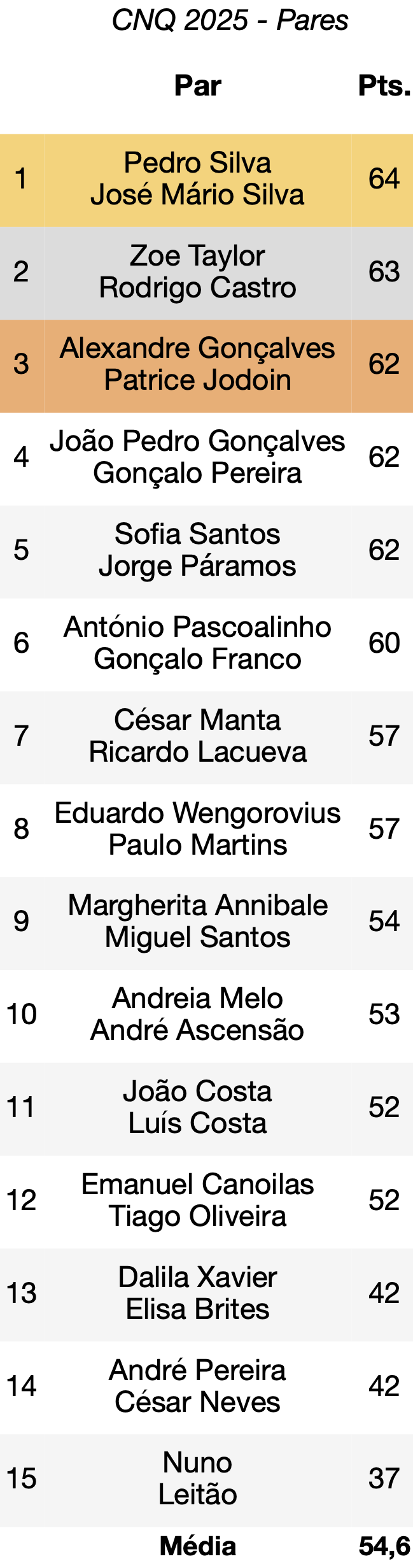 Na competição de Pares sagrou-se campeão o par Pedro Silva + José Mário Silva: uma parceria trans-geracional em que o filho pródigo compensou os esquecimentos do já vetusto progenitor.