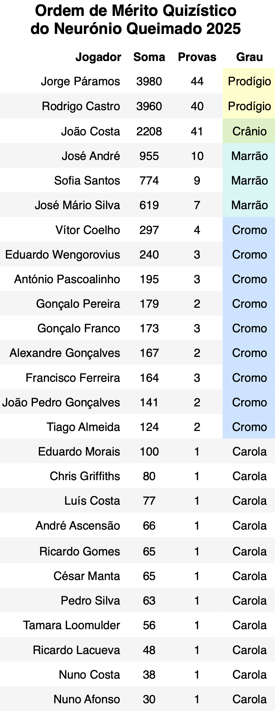 É considerada a soma de pontuações relativas (referentes ao melhor resultado nacional de cada jogo) ao longo de 2025. Assim, são atribuídos os seguintes graus aos jogadores cujo resultado ultrapassou a pontuação mínima indicada: